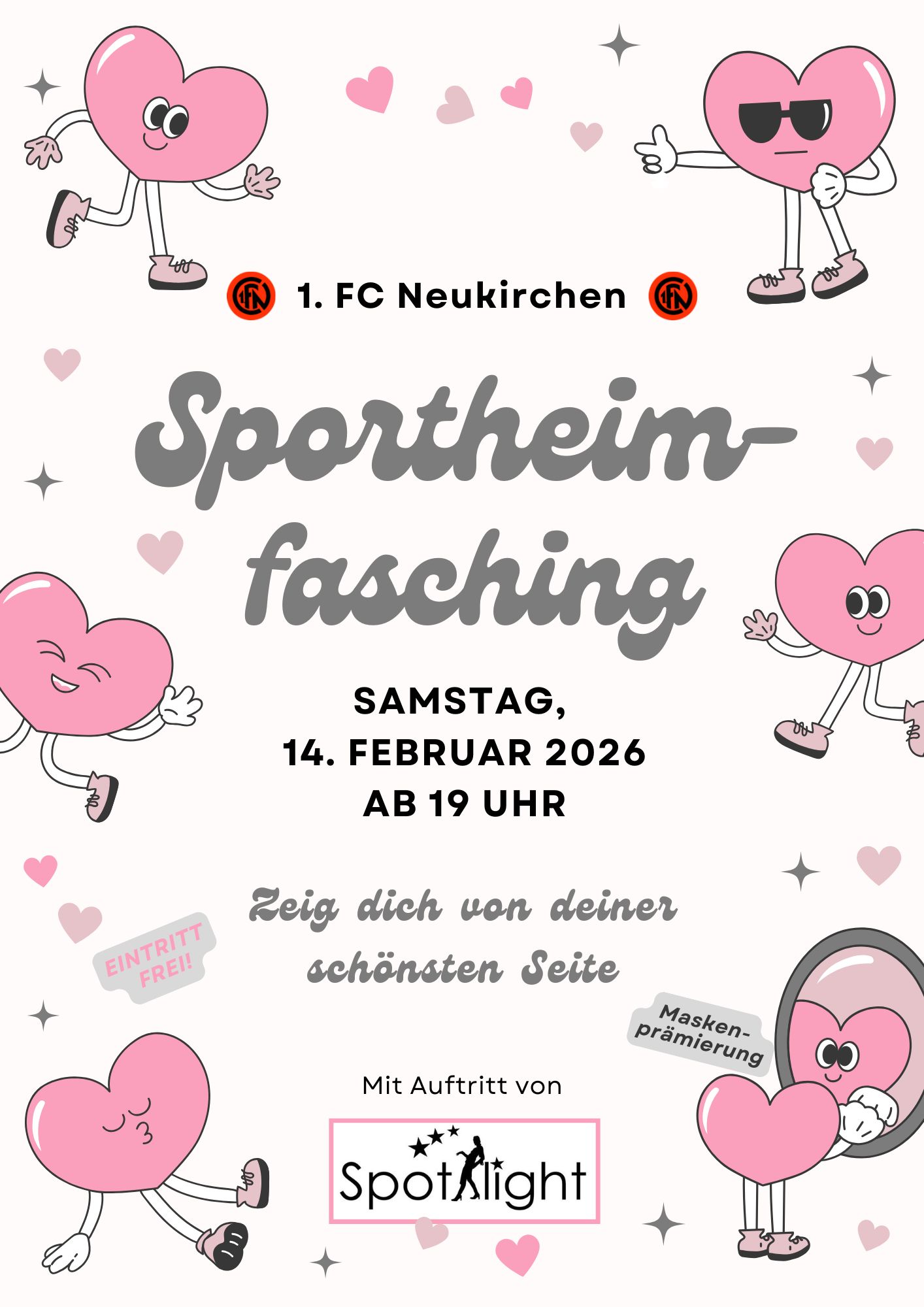 Zum diesjährigen Motto „Zeig dich von deiner schönsten Seite“ begrüßen wir Euch am 14.02.2026 in unserem Sportheim! Was darf dabei natürlich nicht fehlen? Richtig! Ein Auftritt unserer Tanzgruppe „Spotlight“! Lasst Euch verzaubern von ihrem diesjährigen Programm bei uns im Sportheim!